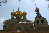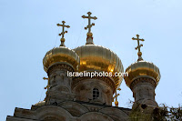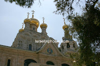Church of Maria Magdalene.Situated on the slope of the Mount of Olives in the Garden of Gethsemane. It was built as a memorial to Empress Maria Alexandrovna by her son the Russian Czar Alexander III and his brothers.Built in the Muscovite style with golden onion domes or cupolas. Each golden dome is surmounted by a cross ending in arrow-like points, and a diagonal bar, which symbolizes the Resurrection.Grand-Duke Sergei Alexandrovich, brother of Alexander III, and his wife Grand-Duchess Elizabeth (Princess Elizabeth of Hesse-Darmstadt), grand-daughter of Queen Victoria and sister of the last Empress of Russia, presided at the consecration of the church of Saint Mary Magdalene in 1888 as representatives of the Emperor.Grand-Duchess Elizabeth, widowed by an assassin’s attack on her husband in 1905, became a nun and founded a convent devoted to nursing and charitable work in Moscow. After the revolution, in 1918, the Grand-Duchess together with her companion Sister Barbara and several members of the Russian Imperial Family were thrown into a mine shaft by the Bolsheviks and left to die. Her remains and those of Sister Barbara eventually were brought to Jerusalem. In 1920, they were laid to rest, in the Saint Mary Magdalene Church.Grand-Duchess Elizabeth and her companion Sister Barbara were canonized as Martyr Saints in 1981 and at this time their relics were moved into the main section of the church where they rest today in marble sarcophagi.Grand-Duchess Elizabeth rests today in a marble sarcophagus.